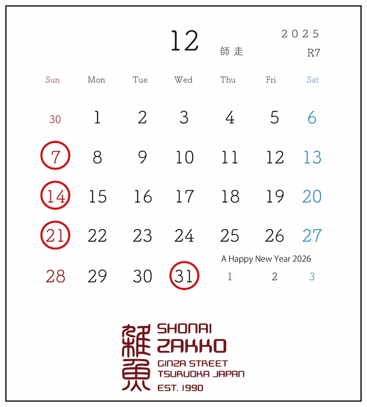 年始は元日から営業で、4日(日)と5日(月)お休みいたします。